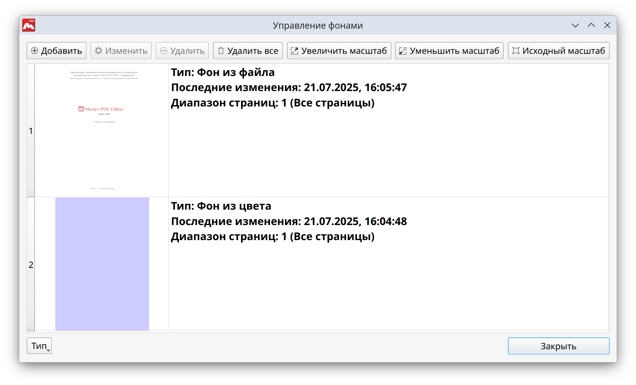 Для изменения уже добавленных фонов выберите в главном меню Документ > Фон > Изменить. Откроется окно Управление фонами.