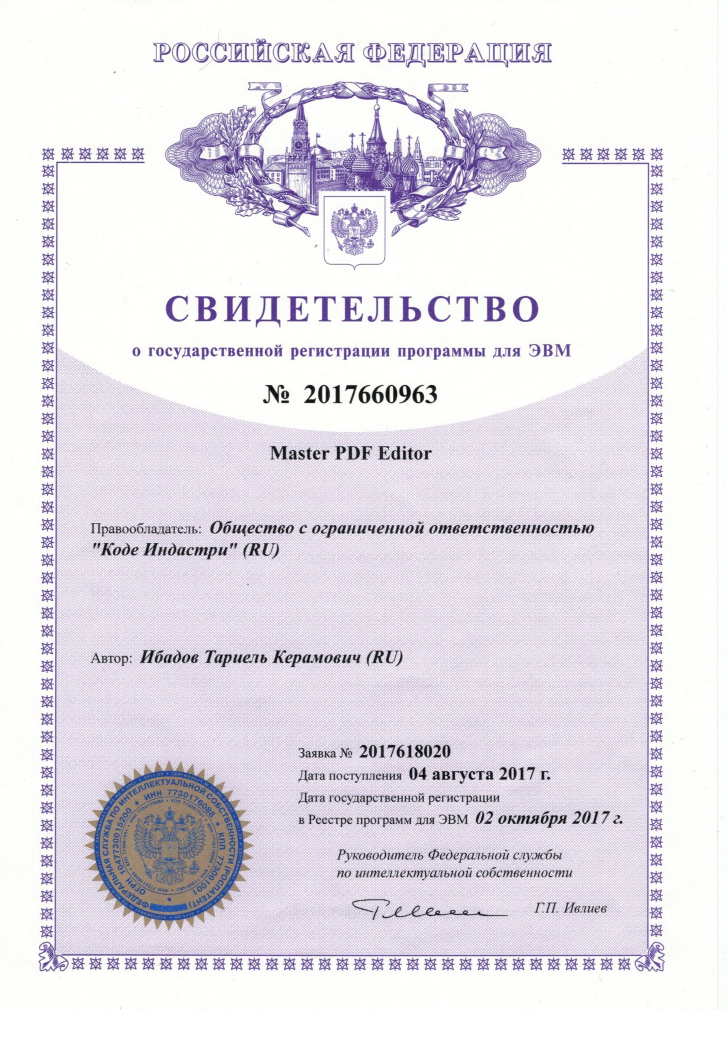Master PDF Editor имеет свидетельство о государственной регистрации программы для ЭВМ № 2017660963 от 02.10.2017.